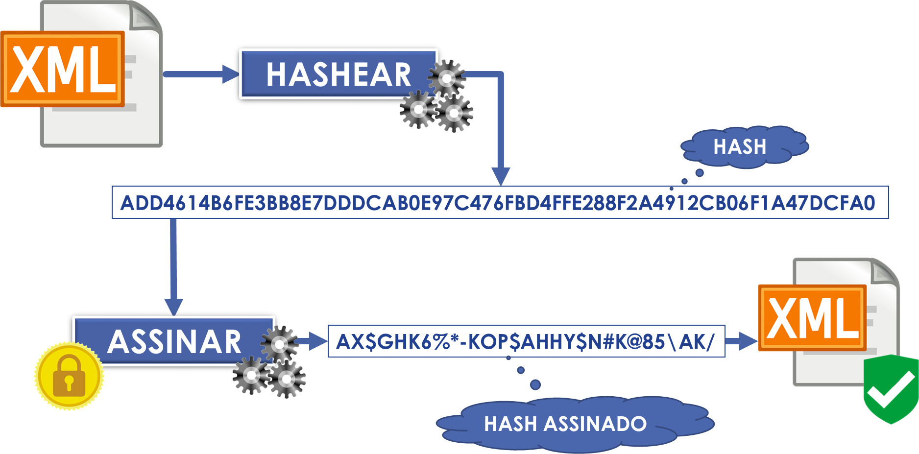 A figura a baixo ilustra o processo de assinatura digital. Neste processo é extraído um código HASH de comprimento fixo que representa unicamente o conteúdo do ficheiro XML. O algoritmo que gera esse código HASH é de conhecimento público e irreversível, ou seja, não é possível derivar o conteúdo XML a partir do código HASH. Também, o HASH garante que o conteúdo XML não pode ser alterado, caso contrário teria que gerar novamente o HASH.